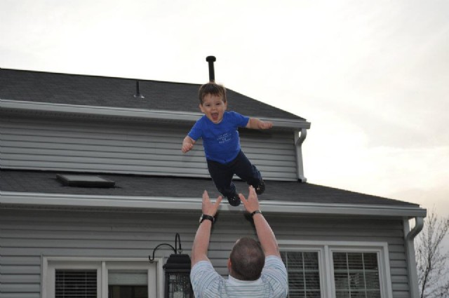 It's photo shopped, the little guy has a pin in his head holding him to the house!